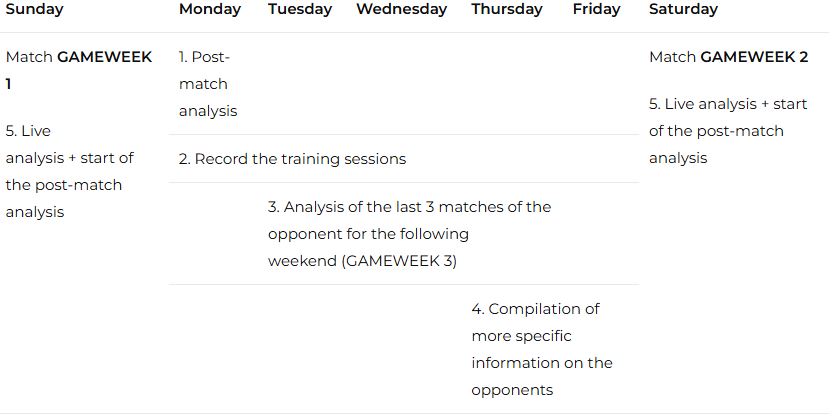 اجرای مدل بازی در مسابقه قبلی را تجزیه و تحلیل میکنند تا محتوای تمرینی را برای هفته پیش رو انتخاب کنند. از این نقطه، کارکنان میتوانند کار جلسه تمرینی را برای بهبود نیازها مطابق با بازی قبلی متمرکز کنند. به عنوان مثال، روی بهبود برخی مفاهیم تهاجمی در لحظه آمادهسازی کار کنند، زیرا تیم در آن لحظه از بازی با مشکلاتی روبرو بود.