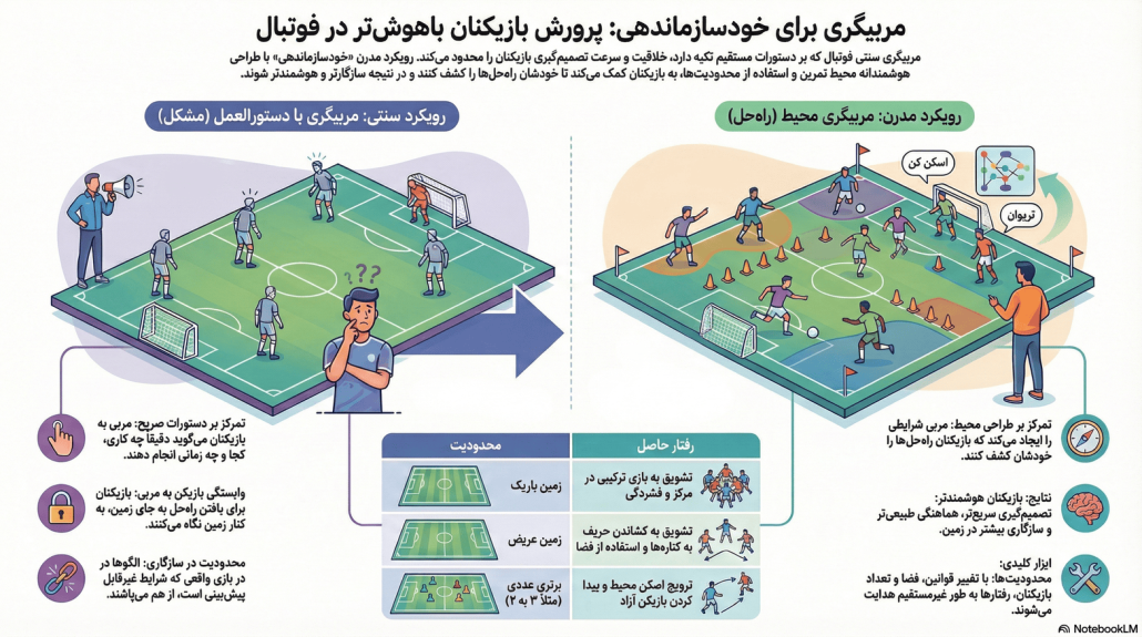 برای مربیان و تحلیلگران، سوال دیگر این نیست که “به بازیکنان چه بگویم که انجام دهند؟” بلکه «چگونه میتوانم جلسه را طوری طراحی کنم که بازیکنان خودشان راهحل را کشف کنند؟»