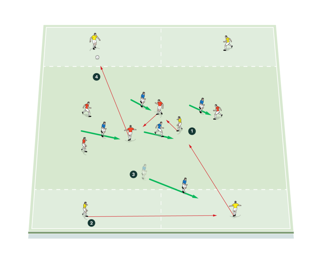یک مهاجم برای دریافت توپ با یک پاس مورب به منطقه پایینی میرود